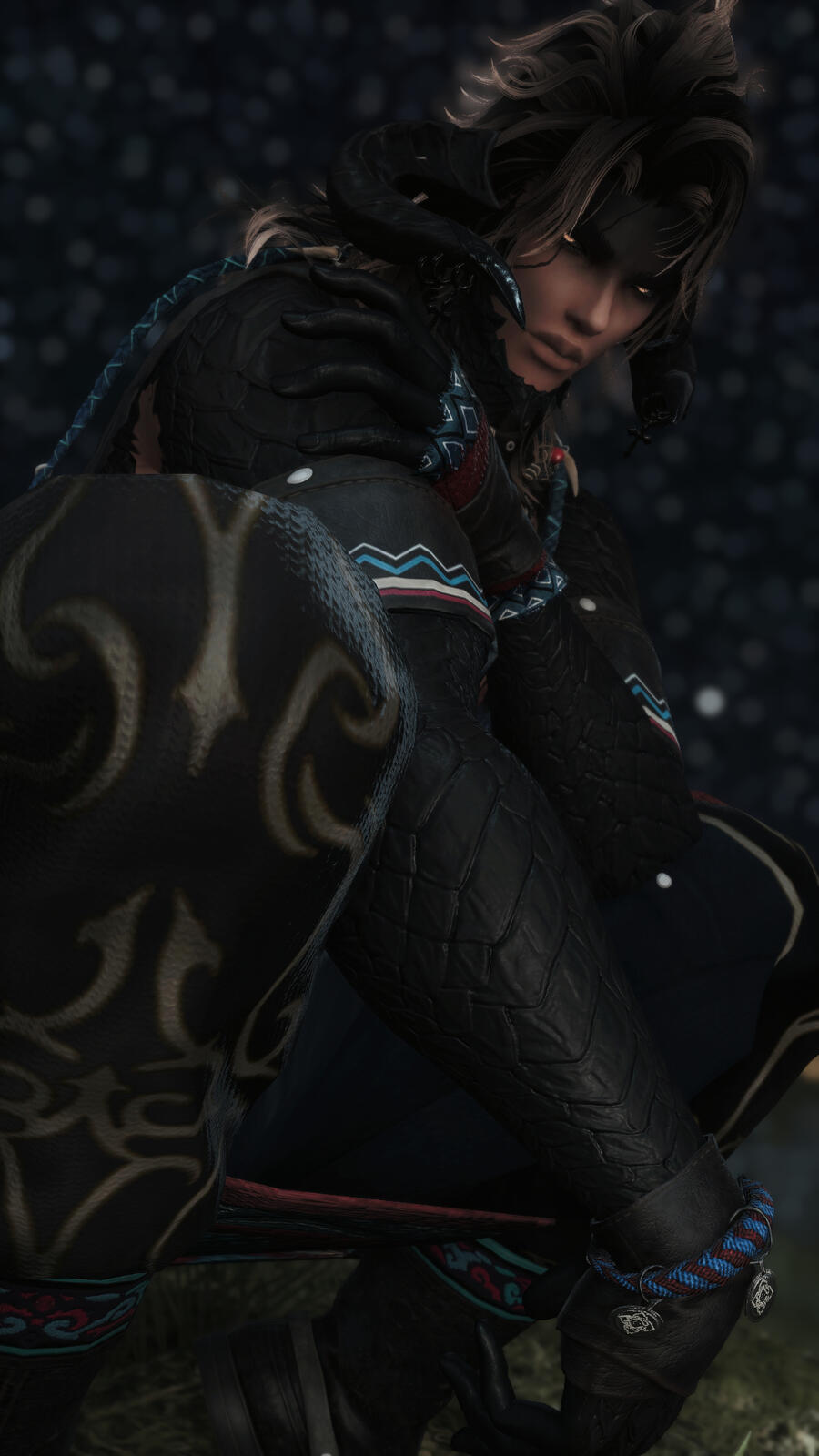 a deeper look: Stoic is a word that Naiman embodies. To endure a life of trials and tribulation with an unceasing grim resolve worn squarely upon his features. Perhaps he was more expressive, once. A boisterous child amongst the tumetsun tribe, an extreme cult-like splinter group from the tumet. But he couldn’t say. It all changed since his coming of age ritual.Alone and bound to a sacred tree. Where hunger and thirst sapped his strength and beasts lurked in that silent dark, he saw a vision. One of blood. A warning that would inspire his desperate struggle to rejoin his family- and warn them of what was to come. Sure enough, they would avoid the ambush of an opposing tribe but a sun later- and Naiman was given both his name, and title of Udgan, to study under his elder who had hitherto held the seat.Perhaps it was the weight of responsibility that muted what he felt he could share to the world. Or perhaps it was what he left unspoken of the dreams and nightmares that stirred in his mind. He would come to learn the rituals and secrets of his elder. Ones of blood.The boy quickly became a man. The man became a husband. The husband became a father. Becoming, like many others of his kin, a warrior of the Steppe, one who sought his honour in battle and gave counsel to his people. ever guided by visions deemed divine, never questioning where or why they were bestowed upon him. A blind faith that'd see him rise and rise. and once he had risen, there was only one place remaining for him- there was the fall.Death comes as naturally as life amongst the warring tribes, his was no different. an inevitibility that demanded he perform his duties as spiritual pillar, guiding his friends, his family in grieving and ceremony. perhaps he simply never expected there existed others so lacking in honour, so weak as warriors, that they would resort to things he thought unimaginable. that they would take what he held most dear. It wouldn't be the visions that brought him to retaliate. It was his own want, his own unleashing of emotion that would see his nightmares of blood brought to reality. and all for such little gain. - a lesson, then. this was why he had to keep his emotions in check. these visions? they were a gift, as they were a curse. they had taken root, and had grown into something deep and dark in his very core.Despite everything, his duties remained. To his people, to his land, to his Goddess above all. So when another vision burned the backs of his eyes, he did not hesitate to chase it. uncertain of why or how this came to be, only knowing that it had to be. His yol took him south to Bozja, to a war. One of blood.